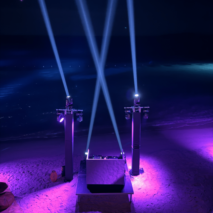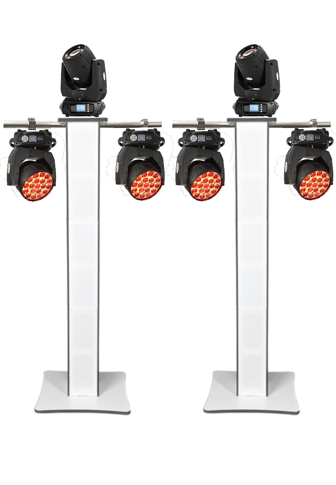 A dynamic lighting setup designed to deliver sharp aerial beam effects and rich color wash for stages, DJ booths, and event spaces. Mounted on two professional lighting totems, this rig adds height, movement, and visual impact to any indoor production.