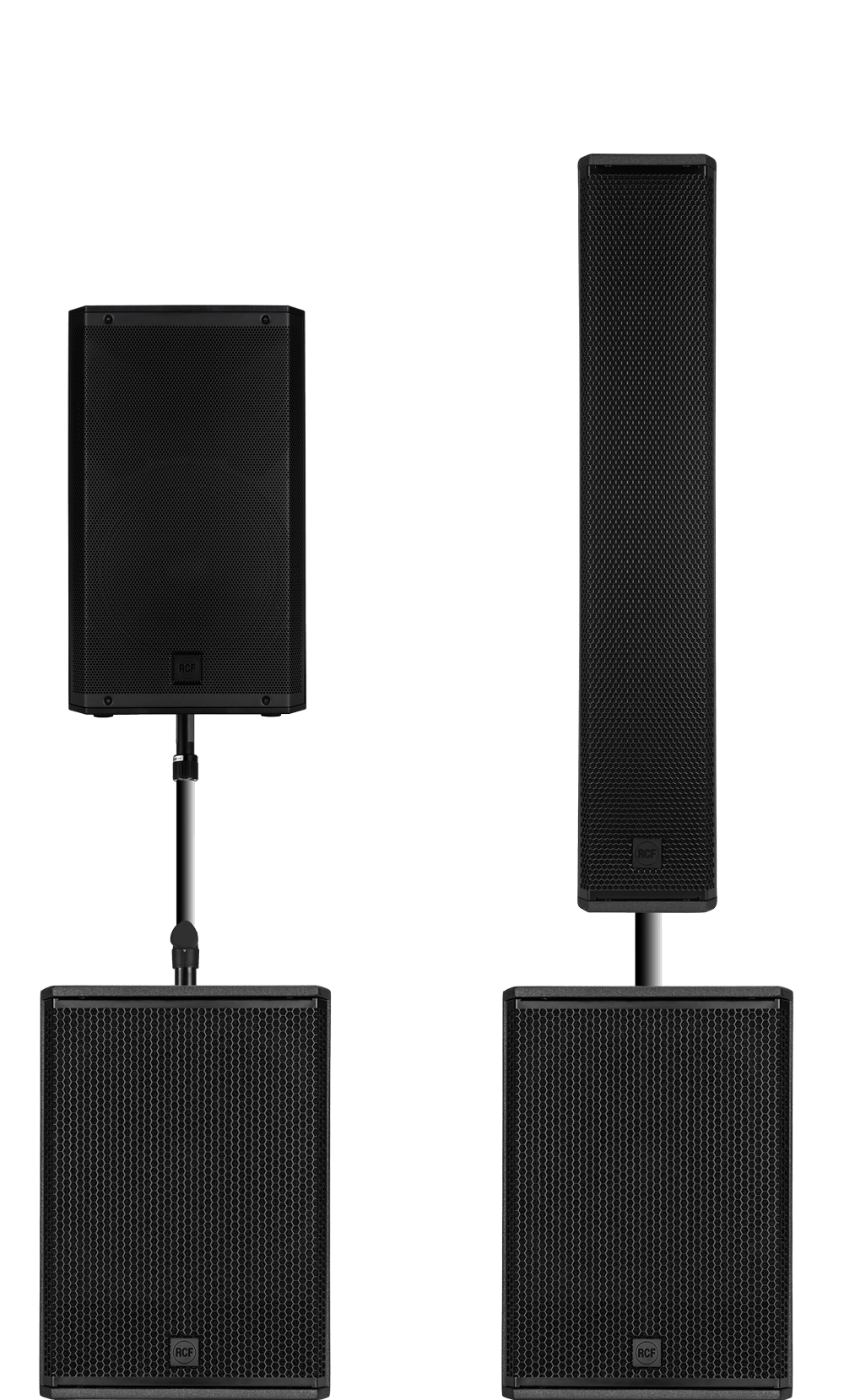 Tops: 2x RCF ART 710 – Compact and lightweight active speakers delivering crystal-clear mids and highs with outstanding vocal definition. Perfect for both speech and music playback.